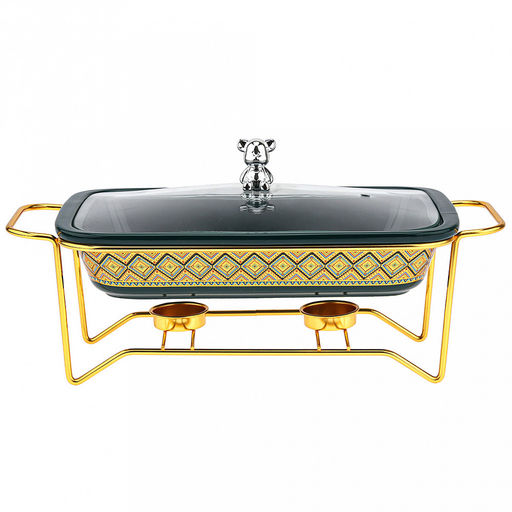 "Мармит Изумруд" Форма для запекания 1,2л, прямоугольная, 29х17,5см h5,5см, керамика с деколью, цвет - изумруд, стеклянная крышка с пароотводом, пластмассовая ручка-кнопка "мишка", металическая подставка с ручками, с подогревом на 2 свечи 36х17,5х11,