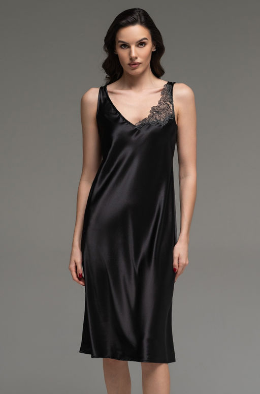 Сорочка средней длины Mia-Amore на тонких регулируемых бретелях выполнена из однотонного смесового шёлка. Сорочка имеет ассиметричные плечи, одна из сторон украшена элементом из ажурного кружева, другая выполняет роль регулируемых бретелей. Состав:70% натуральный шелк, 25% полиэстер, 5% эластан