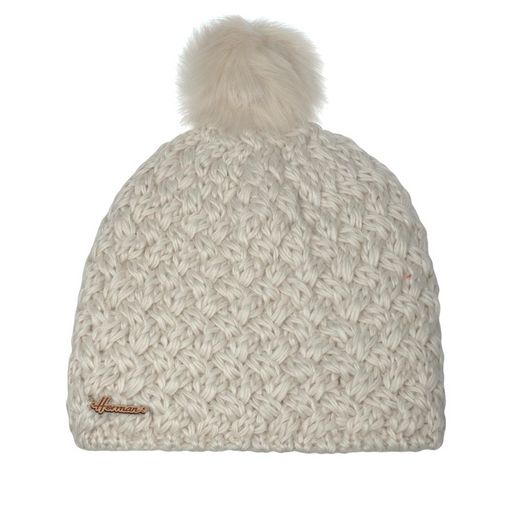 Вязаная шапка с меховым помпоном. Модель MAGGY 8111 выполнена в бежевом цвете объемным плетеным узором. Сбоку головной убор украшает небольшой деревянный значок с логотипом бренда HERMAN.