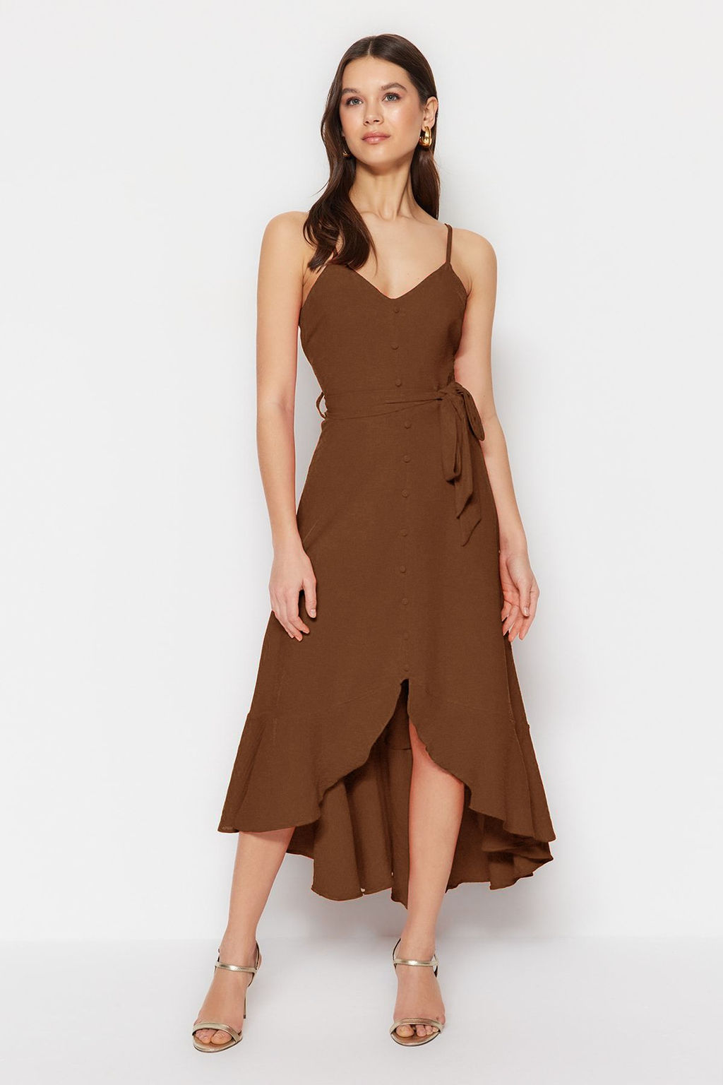 • Kahverengi Kusakl? A-Kesim Volanl? Dugme Detayl? Dokuma Maxi Elbise TWOSS23EL02271
