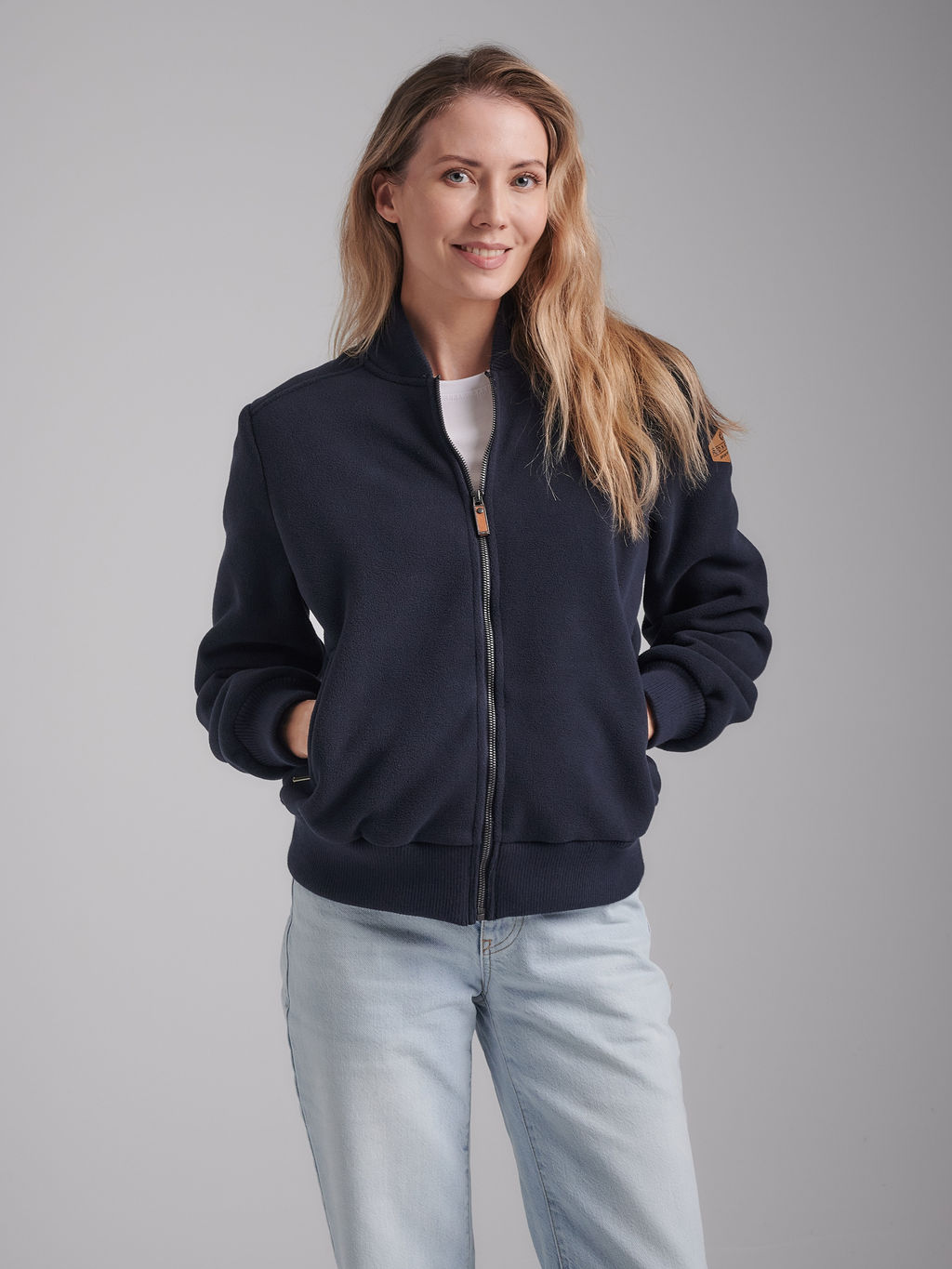 Толстовка-бомбер женская из плотного флиса, дублированного мехом. Застегивается на молнию. Воротник - стойка из эластичного трикотажа. Низ куртки заужен трикотажным поясом. Рукава втачные, низы рукавов на трикотажном манжете. Карманы прорезные, с молниями На левом рукаве шеврон с фирменным логотипом.