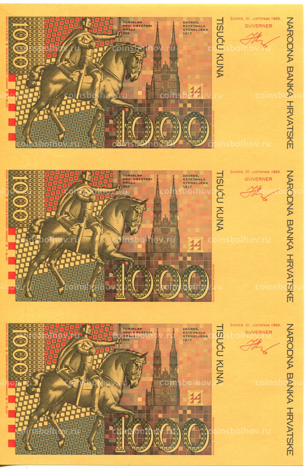 • Банкнота 1000 куна 1993(1994) года Хорватия  неразрезанный лист, пробный