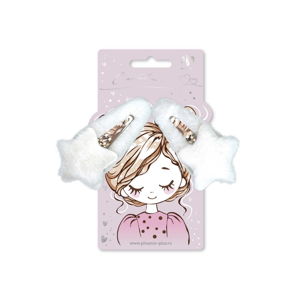 Набор заколок для волос клик-клак, текстильные, арт. 71751 / 10 ПУШИСТЫЕ ЗВЕЗДОЧКИ (в наборе: 2шт., 8,9 см, черный металл, полиэстер, цвет: белый, подложка из мелованного картона + ПЭТ-пакет с европодвесом)