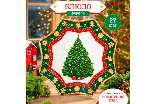 • Блюдо 27*27*2 см "Новогодняя елка" зеленый узор, звезда NEW BONE CHINA
