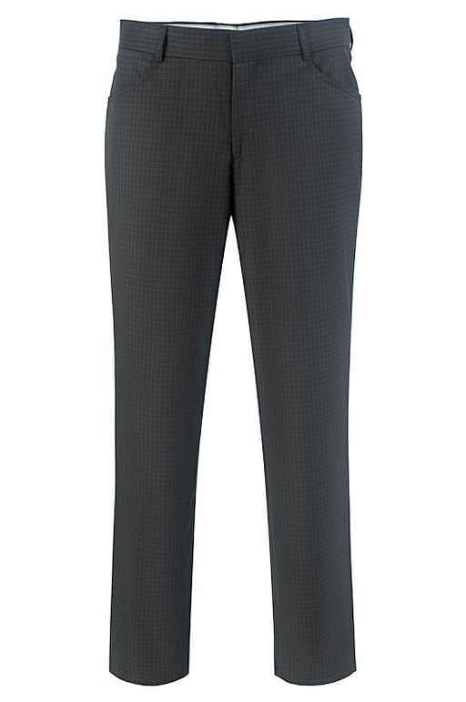 Брюки зауженные, без защипов и стрелок. Ткань - плотная, серого цвета, немнущаяся. Рисунок - неброская светлая клетка. Линия посадки пояса брюк занижена. На передних частях брюк обработаны боковые карманы с отрезными бочками. На задней части брюк располагается 2-а прорезных кармана закрытых клапаном. Состав: 8%-wool, 57%-viscose, 35%-acetat