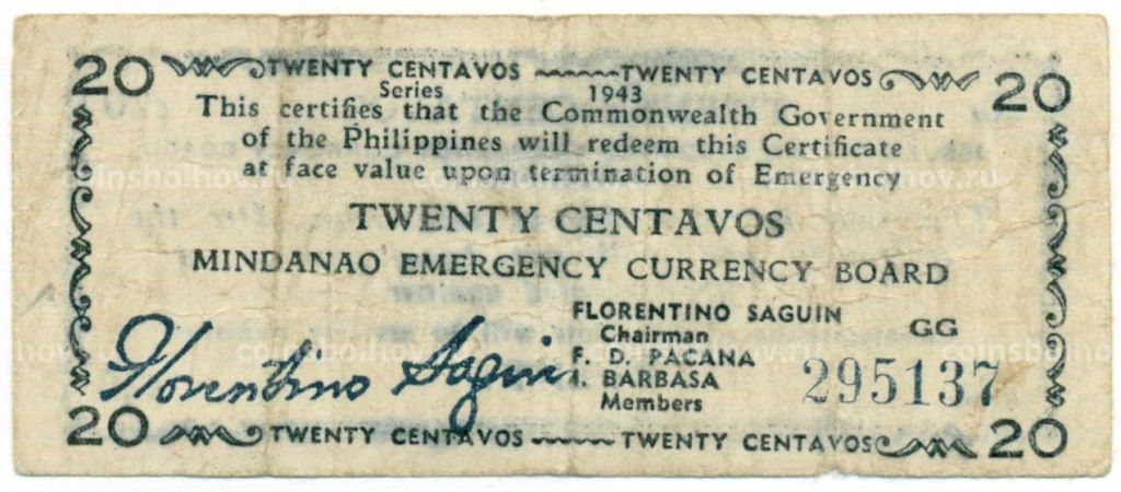 • Банкнота 20 сентаво 1943 года Филиппины (Минданао, Администрация США)