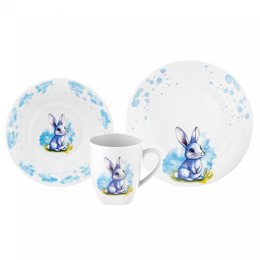 • Набор посуды фарфоровый "Зайка, голубой" 3 предмета: тарелка мелкая д175мм гладкий край, салатник д360мм, кружка 210мл, форма "Глория", подарочная упаковка (Россия)