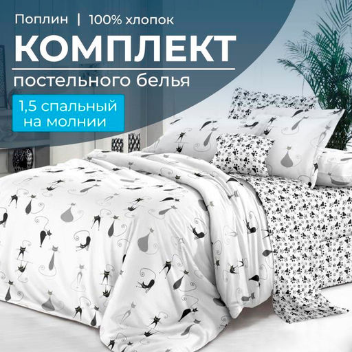 Артикул: Комплект постельного белья 1,5-спальный, на молнии, поплин (Кошечка)