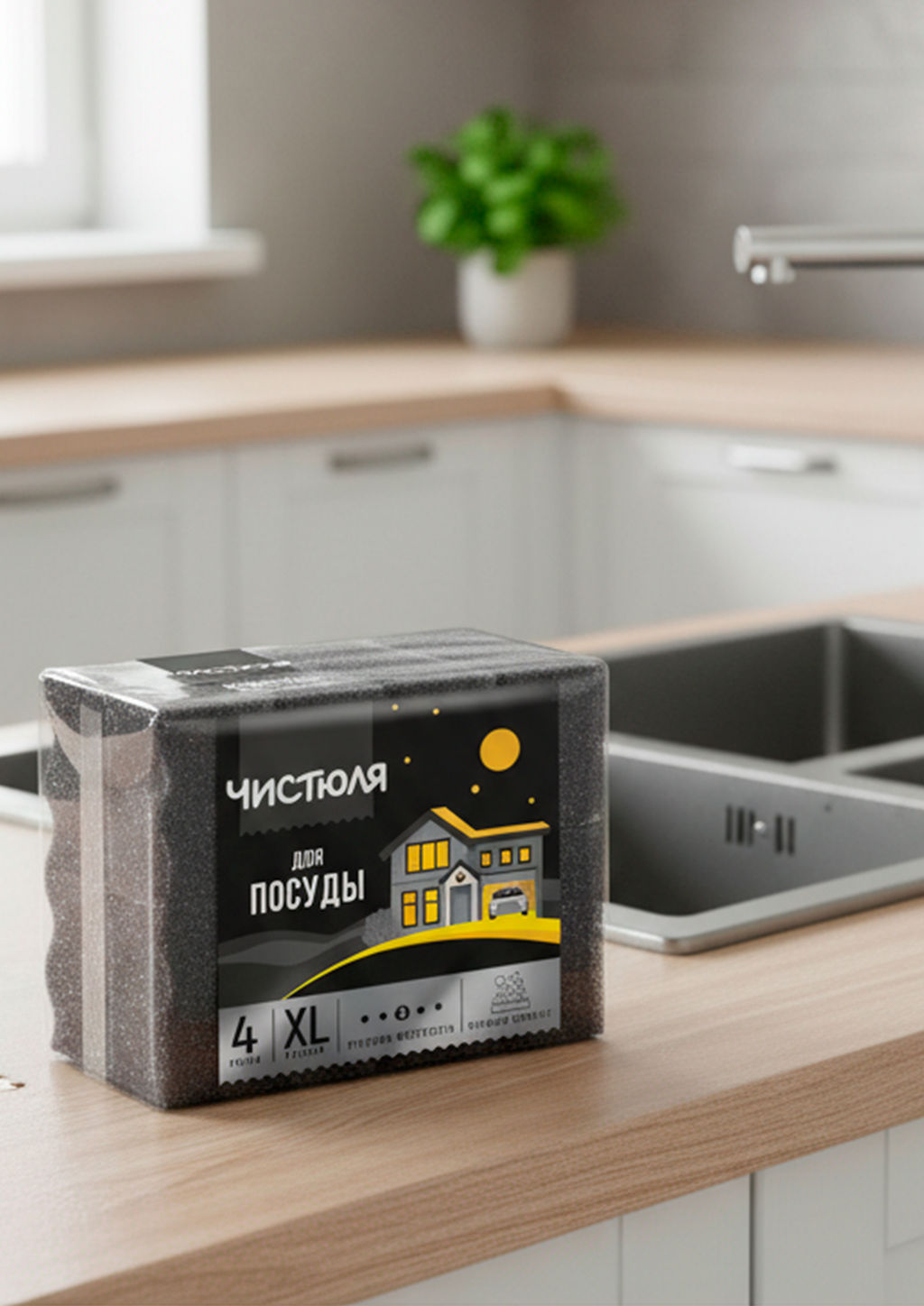 Чистюля 4XL Губка для посуды Защита маникюра XL. Стильные модные черные губки для мытья посуды. Настоящее украшение и для кухни в скандинавском стиле, и для кухни в цветах венге, и для стильного лофта. Вам больше не придется стыдливо прятать губки для посуды. Эргономичные: с фаской для удобного удержания и для защиты ногтей. Комфортный размер XL 9,6 х 6,4 х 4,3 см. Качественный прочный абразив средней жесткости (уровень 3) для сильных загрязнений.­