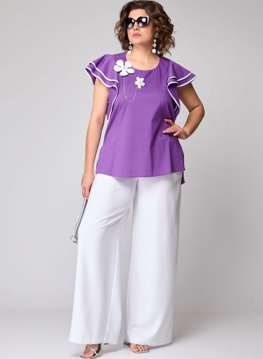 Костюм женский двухпредметный нарядно-повседневнй состоящий из блзы и брюк. Блуза прямого силуэта с фигурным низом, выполнена из хлопка. Вырез горловины круглый на обтачке, рукава втачные двойные "крылышки". В боковых швах обработаны разрезы. Декором служит контрасная окантовка на рукавах и съемная отделочная брошь в виде двух цветов с цепочкой. Брюки "палаццо" на притачном поясе. Пояс по кругу на широкой резинке, в боковых швах обработаны карманы.­