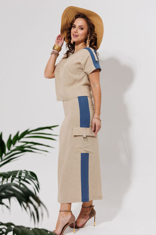 Костюм женский блузка + юбка прямого силуэта, выполнено из льна двух цветов.