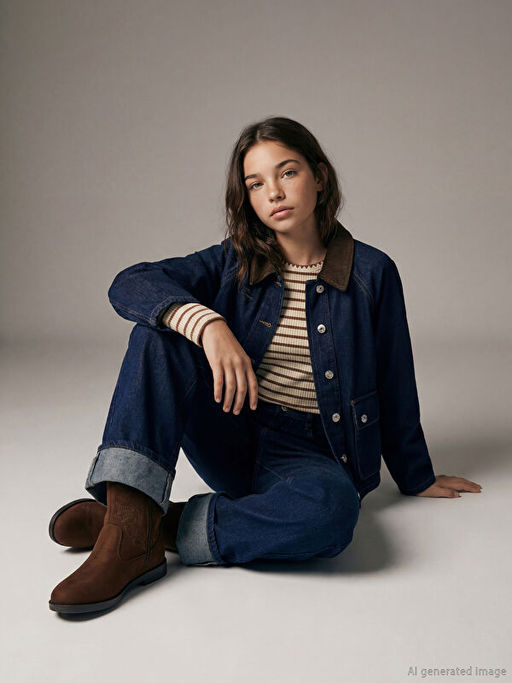• Fitilli Kadife Yaka K?z ?ocuk Jean Ceket