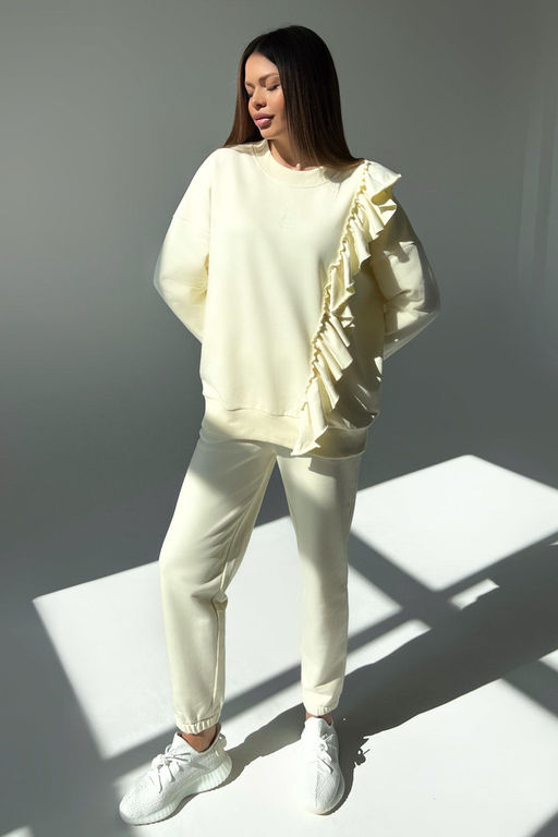 Состав: ПЭ-20%; Хлопок-80%; Современный, женственный костюм, покроя oversize из комфортной ткани (футера пенье). Костюм состоит из джоггеров и свободного свитшота с воланом. Волан с необработанным краем (укреплён строчкой для надежности) пришит асимметрично на левой стороне изделия. Свитшот имеет спущенную линию плеча, прямой силуэт и притачную манжету по низу изделия. По центру переда вышивка логотип в цвет ткани. Рукава с притачной по низу манжетой. Бейка горловины, низ изделия и манжеты рукавов выполнены из ткани - компаньона кошкорсе. Брюки с притачным поясом, резинкой внутри. Передняя половинка брюк с удобными боковыми карманами. Низ брюк присобран на резинку. Длина свитшота по спинке 70-73 см. Длина рукава от горловины 72-74 см для роста 164-170 см, 74-76 см для роста 170-176 см. Полуобхват груди в свитшоте: 42 р. - 69 см, 44 р. - 71 см, 46 р. - 73 см, 48 р. - 75 см, 50 р. 77 см, 52 р. 79 см. Длина брюк по боковому шву с поясом: 99-102 см для роста 164-170 см, 102-104 см для роста 170-176 см. Полуобхват бедер: 42 р. - 49 см, 44 р. - 51 см, 46 р. - 53 см, 48 р. - 55 см, 50 р. 57 см, 52 р. 59 см. -- Характеристики -- Состав: ПЭ-20%; Хлопок-80%; Сезон: Лето Рост: 170 Страна бренда: Беларусь