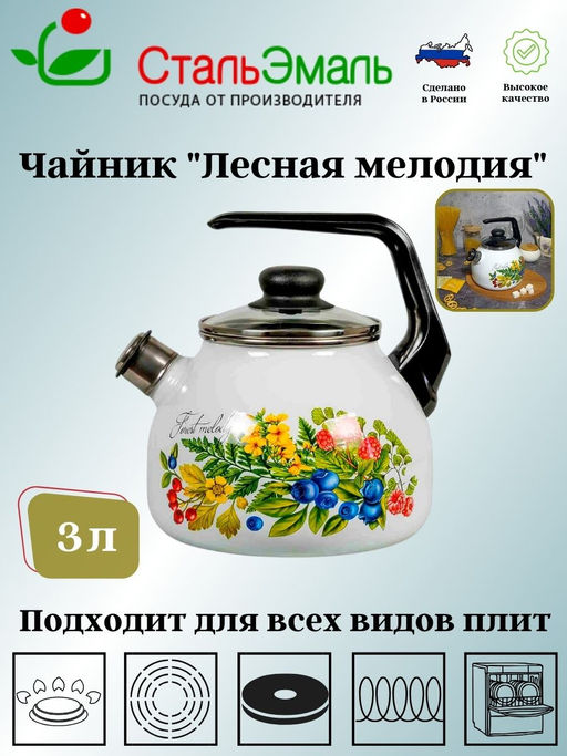 • Чайник для плиты 3,0л сф. со свистком 4с209я Лесная мелодия белосн.