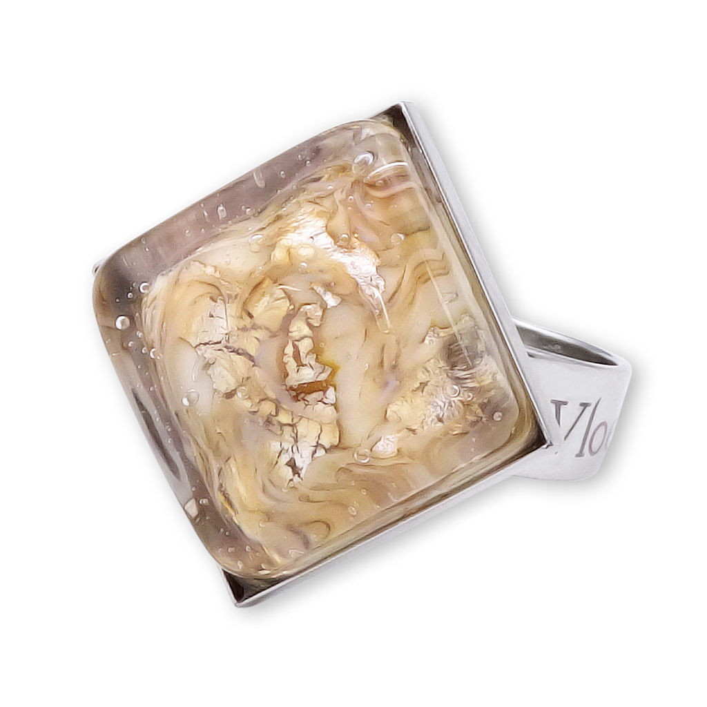 Кольцо изготовлено из муранского стекла и гипоаллергенной ювелирной стали, что очень важно для людей с чувствительной кожей. Металл не темнеет и не подвергается воздействиям окружающей среды, надолго обеспечивая красивый внешний вид изделия. Размер стеклянного элемента - 1,6x1,6 см. Кольцо безразмерное, регулируется с 16 до 19 размера. Вес - 5  гр.