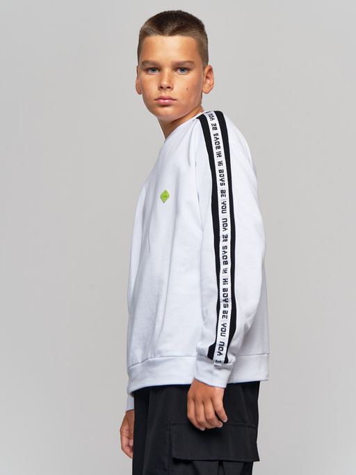 Свитшот для мальчика из футера с начесом, свободного кроя, спущенная линия плеча, кругдая горловина. Рукав длинный на манжете. По середине рукава вставка контрасного цвета с тесьмой. Состав:72% х/б, 20% п/э, 8% лайкра