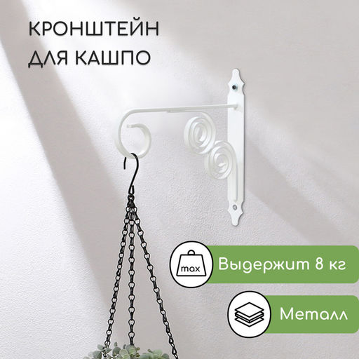 Кронштейн поможет закрепить на стене цветы в подвесных кашпо.ПреимуществаЛаконичный и изящный дизайн легко впишется в пространство.Прочная конструкция из металла выдержит вес кашпо до 8 кг.Изделие не выгорит на солнце, не заржавеет и сохранит первозданный вид на протяжении долгого времени.Подойдёт для украшения:балкона;дачного участка;веранды или беседки;интерьера. Maксимальная нагрузка, кг: 8. Вид установки: Настенное. Бесплатная доставка: Да.
