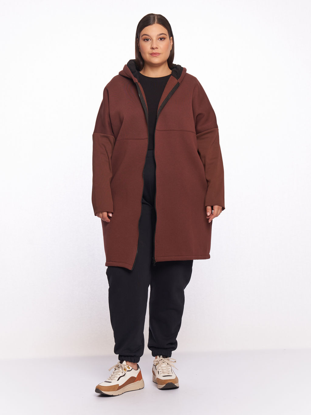 Описание товара Длинное худи на молнии больших размеров коричневого цвета