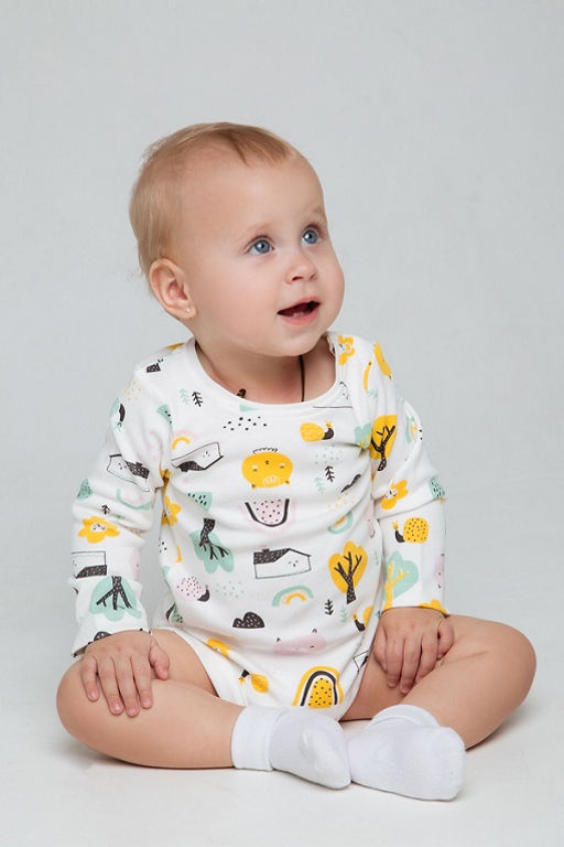 Боди из натурального хлопка с длинными втачными рукавами. Сшито из мягкого трикотажа интерлок и украшено набивным рисунком с домиками в лесу. Эластичный кант по проймам. Застёгивается на кнопки на плече и в паху. Рукава обработаны плоскими швами.­