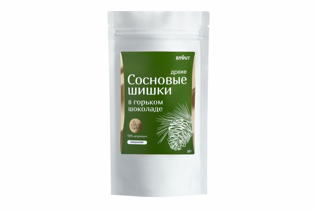 сосновая шишка, сироп (сахар, вода), горький шоколад (какао тёртое, какао-масло, сахар, эмульгатор соевый лецитин, ароматизатор натуральная ваниль), Содержание какао в горьком шоколаде 70,5%. .