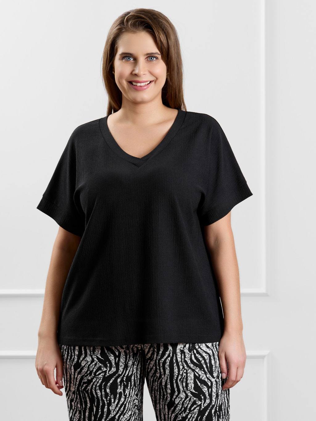 Футболка женская из гладкокрашенного трикотажного полотна бурумчук (шелковый креп), прямого кроя, с углубленным V-образным вырезом горловины, обработанным втачными планками, заходящими друг на друга спереди. Короткие цельнокроеные рукава с притачными манжетами.­