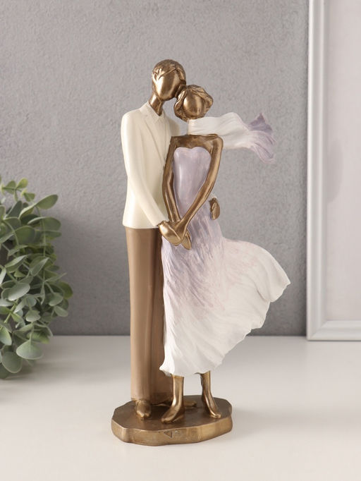 Фигурка изображает пару влюблённых, застывших в момент нежности и единения. Её плавные линии и гармоничные формы передают эмоции, которые вдохновляют и наполняют пространство теплом. Сочетание белого, сиреневого и бронзового оттенков создаёт изысканный контраст, подчёркивающий глубину и выразительность композиции.