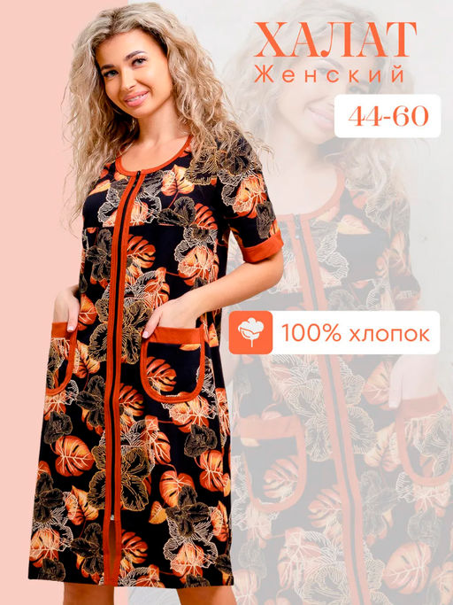 Обратите ваше внимание на женский домашний халат на молнии! С таким халатиком мода дома не умрёт!))) Чудесные расцветки смотрятся свежо и очень нарядно. Изделие имеет широкий размерный ряд: от миниатюрного 44 до больших размеров 54-56. Вы не будете испытывать стеснение и дискомфорт, так как халат изготовлен из хлопковой ткани. Кулирка прекрасно тянется, позволяя Вам свободно двигаться. Длина спинки 98-101 см в зависимости от размера. Полочка длиннее спинки на 5 см. Модель расклешенная, поэтому будет удобна также беременным и кормящим женщинам. Имеются два удобных накладных кармана. Отделка – яркая трикотажная бейка. Очень удобный для выполнения домашней работы короткий рукав. Такая вещь актуальна не только в качестве одежды для дома, она прекрасно смотрится на даче. Халат - подарок для всех девушек и женщин: маме, подруге, бабушке, сестре, коллеге на любой праздник! Параметры модели на фото: 90-65-98. Рост 165 см. На модели 44 размер. Размеры 58-70 ищите в артикуле х124М. -- Характеристики -- Вес: 290 кг Ткань: Трикотаж Состав: 100 % хлопок Отделка: Трикотажная бейка Режим стирки: При 40 градусах Целевая аудитория: Взрослая Розничная цена: 1180