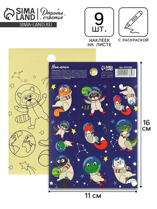 Цена за 10 шт. Наклейки детские «Космические животные», раскраска на обороте, 11×15.5 см