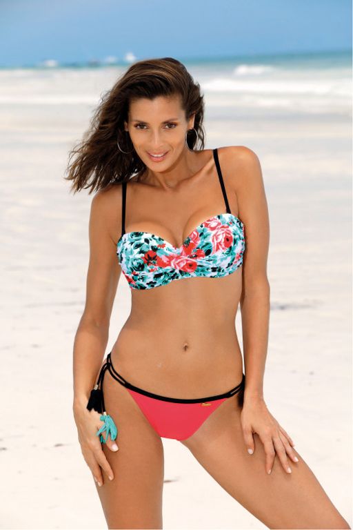 Очень женственный купальник с бюстгальтером в цветы и однотонными, завязанными по бокам трусами в комплекте. Цветочный верх выглядит стильно и романтично. Благодаря хорошо уплотнённым чашкам Вы быстро и эффективно соберёте и поднимете бюст, дополнительно визуально увеличивая его. Костюм включает в себя наполнение пуш-ап, которое позволяет увеличить грудь более чем на размер, сохраняя красивый, естественный эффект (наполнение пуш-ап доступно в любом размере костюма и не снимается с модели). Костюм удобно завязывается на спине, лямки съёмные. Трусы с завязками по бокам, с кокетливыми кисточками - благодаря этому Вы можете регулировать их размер. Итальянская ткань высокого качества. Состав: 80% полиамид, 20% эластан.Размер Обхват под грудью Объём по груди Объём бёдер Высота трусовS 66-71 cm 82-84 cm do 90 cm 19 cmM 69-74 cm 85-87 cm do 94 cm 20 cmL 72-77 cm 88-90 cm do 98 cm 21 cmXL 75-80 cm 91-92 cm do 102 cm 22 cm2XL 78-83 cm 93-94 cm do 106 cm 23 cm