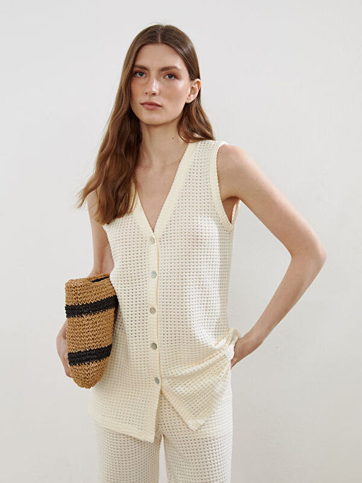• V Yaka Kendinden Desenli Kad?n Yelek