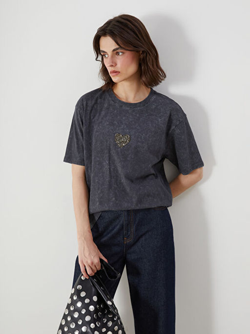 Bisiklet Yaka Kalp Nak??l? Oversize Kad?n Ti??rt