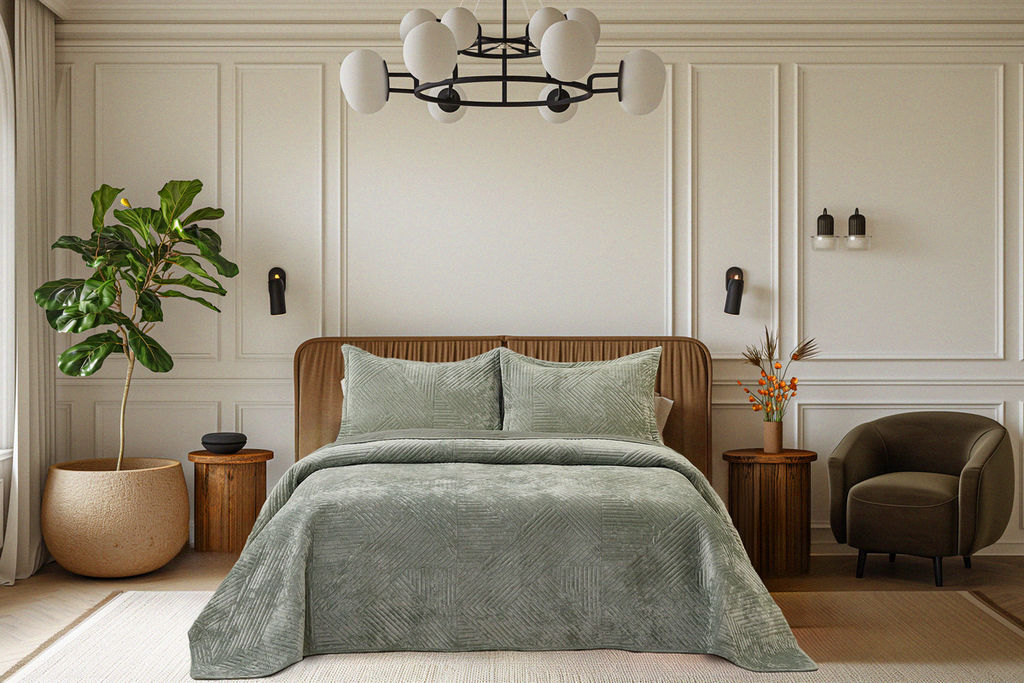 Покрывала Шелфорд представлены в пяти насыщенных акцентных цветах: изумруд, пепельная роза, светло-серый, крем, серый.