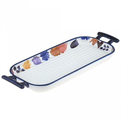 • Форма для запекания керамическая "Сезон" 360мл, 26,5х10,8х2,5см, гриль, прямоугольная, 2 ручки, общая длина 32см, белый/синий, в коробке (Китай)