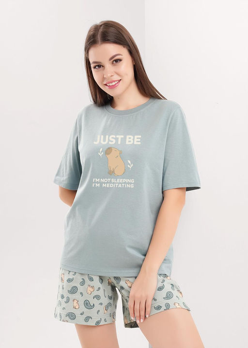 Набор одежды для дома и отдыха из хлопкового трикотажного полотна. Футболка прямого кроя, короткий втачной рукав, округлая горловина с обтачкой. Спереди принт. Короткие шорты свободного кроя, цельнокроеный пояс на внутренней резинке. Боковые разрезы.