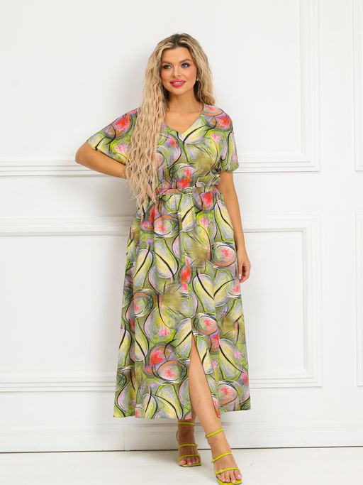 Яркое платье полуприлегающего силуэта из текстильной ткани зеленого цвета. V-образный вырез изделия обработан внутренней обтачкой. Платье с цельнокроеными рукавами. Линия талии завышена и эффектно подчеркнута втачным поясом с резинкой. По переду изделия - разрез. По бокам изделия - внутренние карманы. Длина изделия по спинке от плечевого шва до низа изделия - см. Рост фотомодели - 170 см.