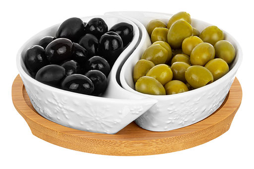 Набор 2 тарелок под оливки Снежинки на деревянной подставке подойдёт для подачи закусок к праздничному столу. Размер каждого изделия 14х7х2,5 см, объём 100 мл. Размер подставки 15х15х1 см. Изделия выполнены из высококачественного белого фарфора и украшены рельефом в виде снежинок. Фарфор легко отмывается и не впитывает цвет продуктов. С маленькой менажницей вы сможете красиво подать маслины, орехи или сыр. Она также послужит в качестве небольшой конфетницы: угостите себя и гостей любимыми сладостями. Не рекомендуется применять абразивные моющие средства. Ёмкости без бамбуковых элементов можно использовать в посудомоечной машине и микроволновой печи. Бамбук нельзя замачивать. Набор поставляется в красивой картонной упаковке. Он станет прекрасным подарком на Новый год или Рождество и стильным дополнением вашего кухонного инвентаря. Новогодняя серия Снежинки отлично подойдёт для сервировки стола в зимние праздники и поможет создать атмосферу уюта.