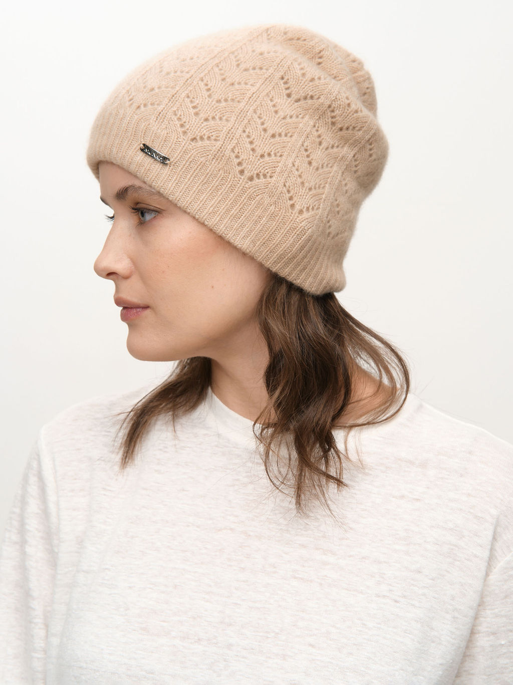 Кашемировая шапка в бежевом оттенке утончённая модель с ажурной фактурной вязкой, которая сочетает комфорт, лёгкость и элегантность. Натуральный кашемир мягко окутывает теплом, создавая ощущение уюта даже в холодные дни. Лаконичный дизайн с деликатной металлической брендированной пластиной подчёркивает премиальный характер изделия. Универсальная модель для базового гардероба в спокойной нейтральной гамме.