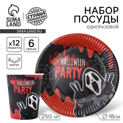 • Посуда одноразовая бумажная для праздника Halloween party, 6 тарелок, 6 стаканов