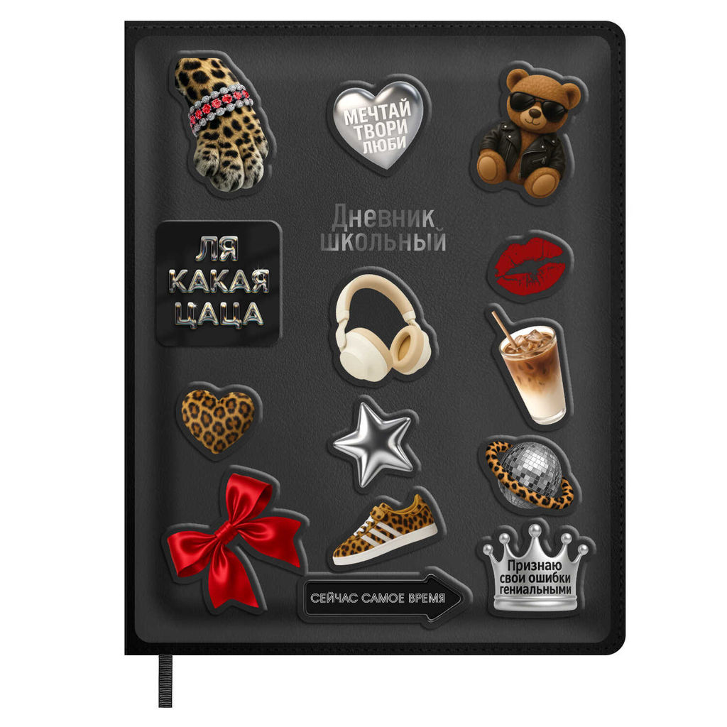 Дневник школьный в комплекте с наклейками декор., арт. 72464 / 15 СТИКЕРЫ НА ЧЁРНОМ (кожзам: А5+; твёрдый переплёт с поролоном, материал обложки: искусственная кожа "Плезир"; декор: блинтовое тиснение; способ крепления блока: ниткошвейный; вн. блок: 48 л., белый офсет 80 г/м?, печать в одну краску, справочный материал: универсальная шпаргалка; отделка среза: окрашивание пантоном; закладка: одно ляссе; форзац: печать пантоном; особенности: 1 лист с 3D-наклейками из эпоксидной смолы в комплекте; индивидуальная упаковка: промостикер + ПЭТ-пакет)