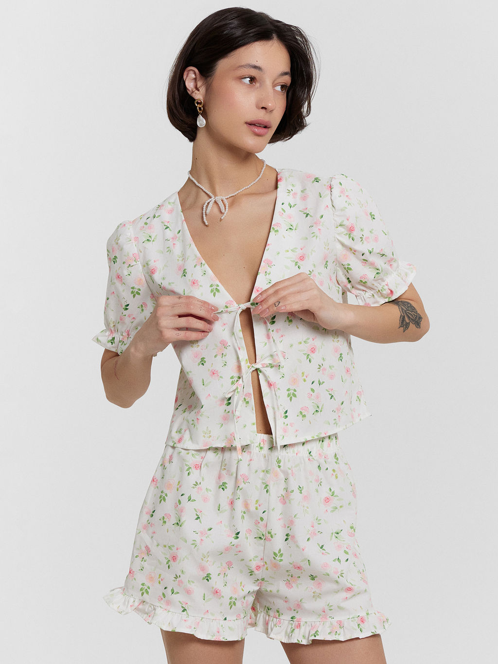 Шорты свободного силуэта, укороченные, с посадкой на талии. Пояс цельнокроеный, с втачной эластичной тесьмой 30RV. В низу шорт рюши, обработанные в подгибку.­