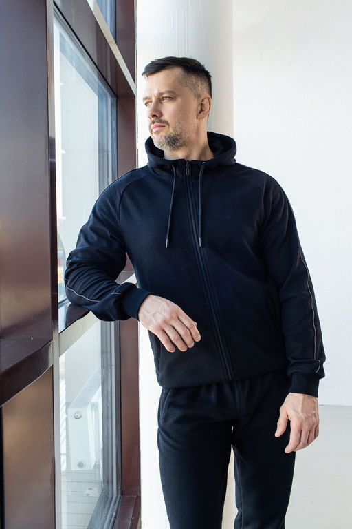 Верх — толстовка на молнии с капюшоном и удобной посадкой. Прорезные боковые карманы на молнии и аккуратные лампасы по рукавам придают образу динамичность. Манжеты по низу и на рукавах обеспечивают комфорт и устойчивость формы.