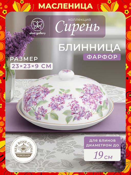 Блинница Elan Gallery "Сирень" размером 23х23х9,5 см выполнена из фарфора new bone china. Внутренний диаметр тарелки под крышкой 19 см. Высота без крышки 2 см. New bone china сочетает в себе изящность и высокую прочность. От классического костяного фарфора материал отличается большей экологичностью в производстве. Блинница поможет отпраздновать Широкую Масленицу со вкусом! Масленица это чудесный повод собраться за праздничным столом и насладиться тёплой атмосферой и традиционной русской кухней. В ассортименте бренда Elan Gallery вы найдёте предметы декора и красивую посуду для приготовления и сервировки масленичных блюд. Пусть Масленичная неделя принесет вам радость и множество вкусных моментов! Коллекция "Сирень" это посуда из белого фарфора с золотым окаймлением, вдохновлённая нежным весенним цветением. Чётко прорисованные детали и мягкая палитра фиолетовых оттенков так реалистично передают очарование цветущей сирени, словно её лёгкий аромат витает над вашим столом. Блюдо с крышкой можно использовать не только для хранения блинчиков и оладий, но и подачи печенья, кусочков торта и пирога. Под крышкой блины долго не остынут и сохранят свой первозданный вид и вкус. Блинница эстетично смотрится на столе и подойдёт для сервировки нарезки, бутербродов и выпечки. Можно использовать для подачи сыра, шашлыка, пиццы, а также фруктов, десерта и разноса любых закусок на празднике. Не рекомендуется применять абразивные моющие средства. Из-за золотого канта нельзя использовать в посудомоечной машине и микроволновой печи. Поставляется в стильной картонной коробке. Красивый кухонный инвентарь отличный подарок на любой праздник! Благодаря красочной коробочке не понадобится подарочная упаковка. Сервировочная тарелка с крышкой станет украшением вашего стола как на праздник, так и в будни и поможет сохранить тепло и аромат продуктов. Коллекция посуды "Сирень" от бренда Элан Галерея создаст весеннее настроение в вашем доме вне зависимости от сезона!