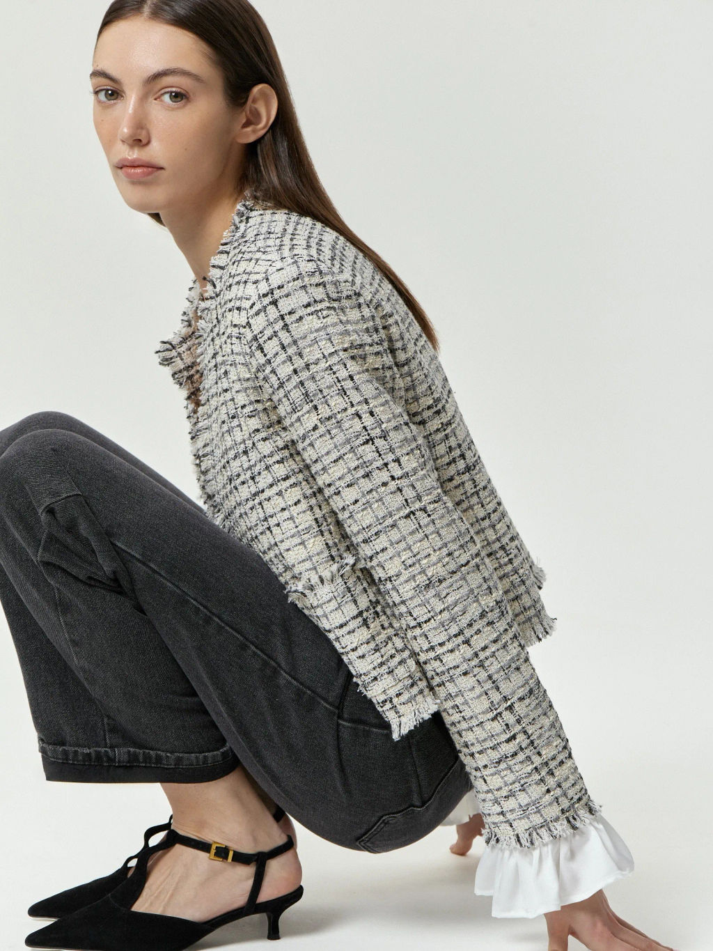 Твидовый жакет без пуговиц. Изюминка модели отстёгивающиеся оборки на рукавах. Необработанный край также добавляет оригинальности и живости. Фактурный материал с содержанием вискозы и хлопка сочетает в себе несколько базовых оттенков. За счёт этого увеличивается потенциал сочетаемости вещи. Укороченная модель прямого кроя имеет накладные карманы по бокам. Изделие выполнено на подкладке, не имеет застёжек. Дополнить образ можно любым денимом.