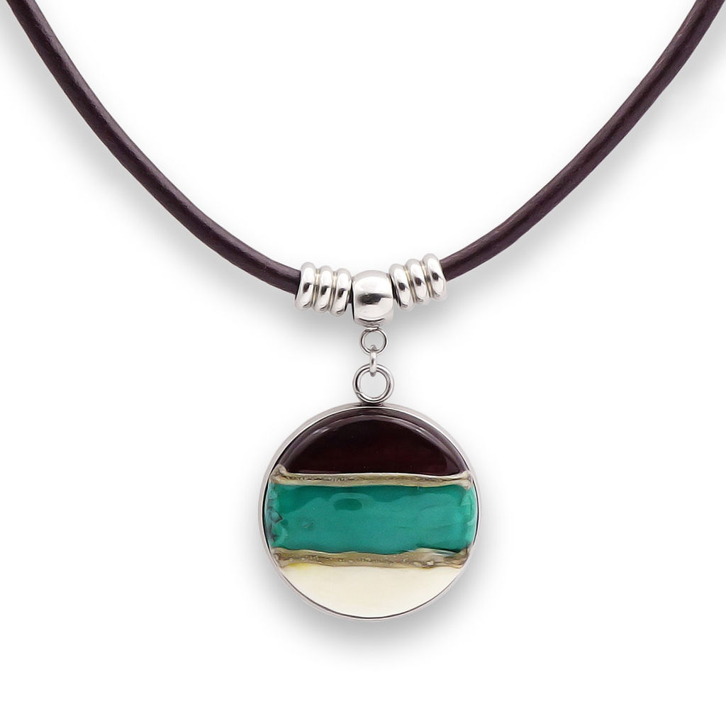 Колье изготовлено из натуральной кожи, муранского стекла и гипоаллергенной ювелирной стали, что очень важно для людей с чувствительной кожей. Металл не темнеет и не подвергается воздействиям окружающей среды, надолго обеспечивая красивый внешний вид изделия. Длина колье - 46 см + 5 см. удлиняющая цепочка. Диаметр стеклянного элемента - 2,5 см. Вес - 15 гр.­