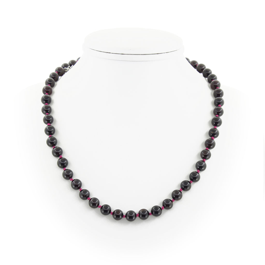 Изящные бусы из натурального индийского граната дополнят Ваш повседневный или праздничный образ. Украшение на нити, с узелками через каждую бусину и замком-карабином из ювелирного сплава. Диаметр бусин 8мм. Длина бус 45см, регулируется до 50см за счёт цепочки.