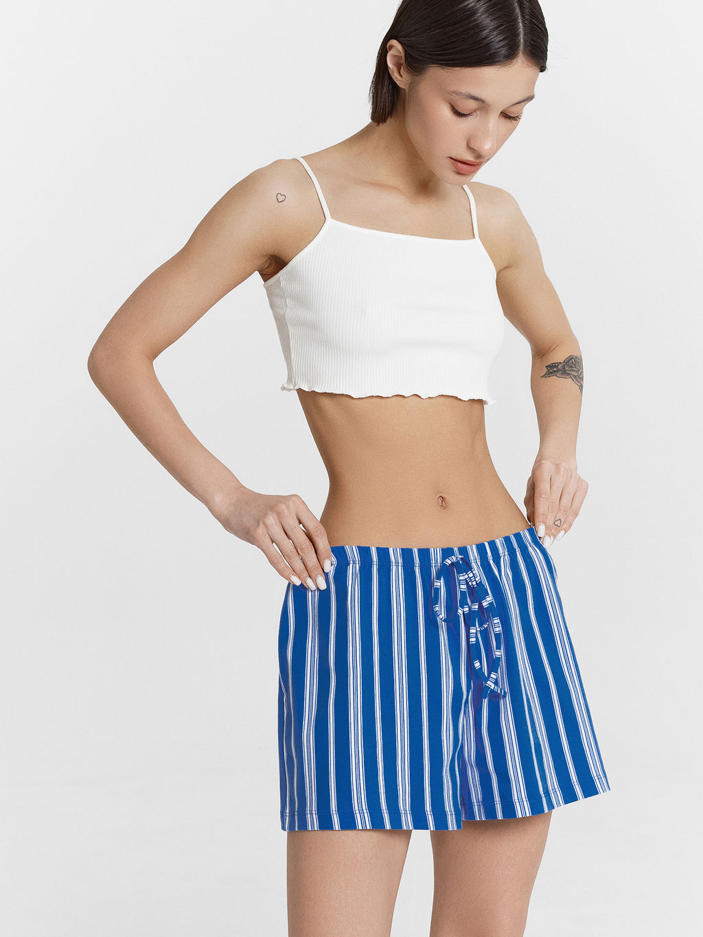 Хлопковые шорты из кулирного полотна. Силуэт прямой, длина мини. Пояс с эластичной тесьмой и имитацией завязки. Уютные шортики!­