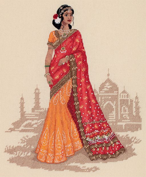 Описание В набор для вышивания PANNA входит: канва Zweigart Lugana 25, хлопчатобумажные нитки мулине Gamma на держателе, 5 цв. бисера, игла для вышивания Gamma, цветная схема, инструкция по вышиванию. Размер готовой работы: 28.5 х 34 см. Одежда народов мира многогранна и очень разнообразна. Национальный костюм это важная часть страны, рассказывающая о ее истории, культуре и традициях. Основной тип индийской женской одежды сари, отрез материи, обертывающий все тело, на драпировку которого необходима ткань длиной от 4.5 до 9 метров и шириной 1.2 метра. Традиционно материал, из которого сделано сари, зависит от социального положения и достатка женщины, но способ носить и драпировать его един для данной местности