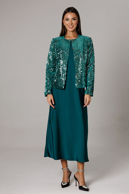 Состав: Жакет: Вискоза-20%; ПЭ-77%; Спандекс-3%; Платье: Вискоза-30%; ПЭ-68%; Эластан-2%; Жакет полуоблегающего силуэта с притачными рельефными бочками на спинке, полочке из эффектной ткани с пайетками. Застежка фронтально-вертикальная на скрытую кнопочную систему. Рукав втачной двухшовный. Длина жакета по спинке 54- 55 см, длина рукава 61-62 см. Горловина округлой формы. Платье комплекта А-силуэта, без рукавов. Крой выполнен по косой, что придает изделию струящийся шарм. Горловина округлой формы. Линии проймы и горловины обработаны укороченным обтачным чехлом из основной ткани. Длина изделия 124-127 см (в зависимости от размерного ряда). Представленная фурнитура может отличаться от представленной на фото/видео материале. Особые рекомендации: рекомендуется холодная деликатная ручная стирка, без использования отбеливающих СМС, без интенсивного трения. Сушка в вертикальном положении. ВТО с минимальным паром. -- Характеристики -- Состав: Жакет- Вискоза-20%; ПЭ-77%; Спандекс-3%; Платье- Вискоза-30%; ПЭ-68%; Эластан-2%; Сезон: Осень-Зима Рост: 164 Страна бренда: Беларусь