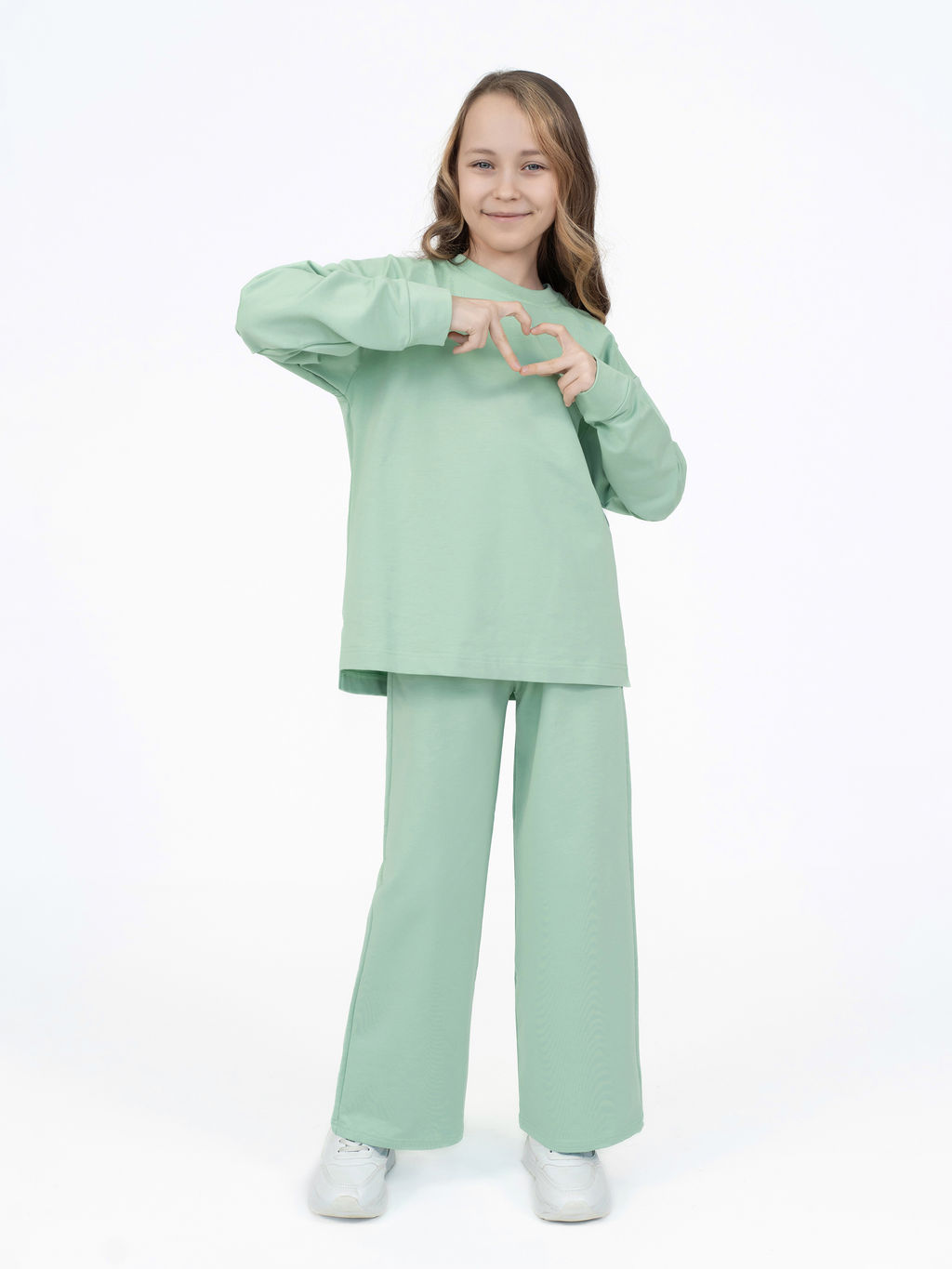 Модный трикотажный костюм для девочек из футера. Состоит из свитшота и широких брюк палаццо. Горловина эластичная, на рукавах манжеты, по бокам небольшие разрезики. Брюки на резинке в поясе. Выпускается в красивом однотонном цвете зеленый дым.