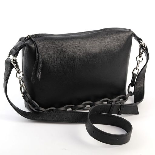 Женская из натуральной качественной кожи черного цвета с съемной, декоративной цепью. Закрывается на молнию. Внутри одно отделение и боковые кармашки, два на молнии и два открытых. Снаружи, на задней стенке карман на молнии. Сумка имеет регулируемый по длине наплечный ремешок.­